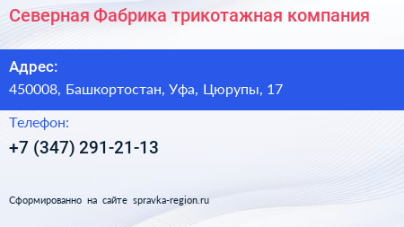 Северная Фабрика, трикотажная компания по адресу 450008, Башкортостан, Уфа, Цюрупы, 17 в дальнейшем Организация, размещена в следующих категориях: