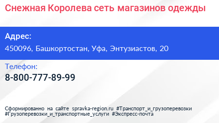 Снежная Королева, сеть магазинов одежды по адресу 450096, Башкортостан, Уфа, Энтузиастов, 20 в дальнейшем Организация, размещена в следующих категориях:
