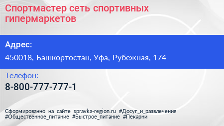 Спортмастер, сеть спортивных гипермаркетов по адресу 450018, Башкортостан, Уфа, Рубежная, 174 в дальнейшем Организация, размещена в следующих категориях: