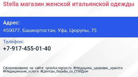 Stella, магазин женской итальянской одежды по адресу 450077, Башкортостан, Уфа, Цюрупы, 75 в дальнейшем Организация, размещена в следующих категориях: