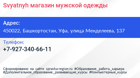 Svyatnyh, магазин мужской одежды по адресу 450022, Башкортостан, Уфа, улица Менделеева, 137 в дальнейшем Организация, размещена в следующих категориях: