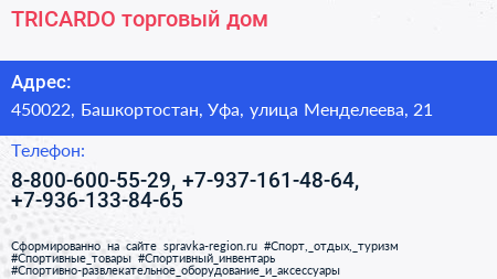 TRICARDO, торговый дом по адресу 450022, Башкортостан, Уфа, улица Менделеева, 21 в дальнейшем Организация, размещена в следующих категориях: