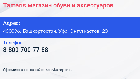 Tamaris, магазин обуви и аксессуаров по адресу 450096, Башкортостан, Уфа, Энтузиастов, 20 в дальнейшем Организация, размещена в следующих категориях: