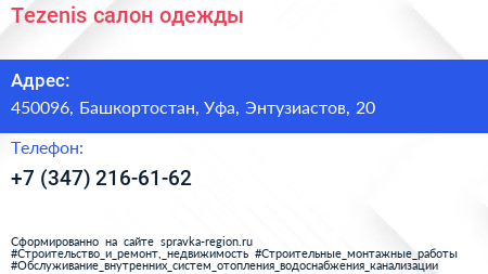 Tezenis, салон одежды по адресу 450096, Башкортостан, Уфа, Энтузиастов, 20 в дальнейшем Организация, размещена в следующих категориях: