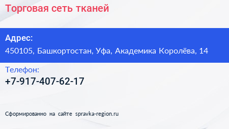 Торговая сеть тканей по адресу 450105, Башкортостан, Уфа, Академика Королёва, 14 в дальнейшем Организация, размещена в следующих категориях: