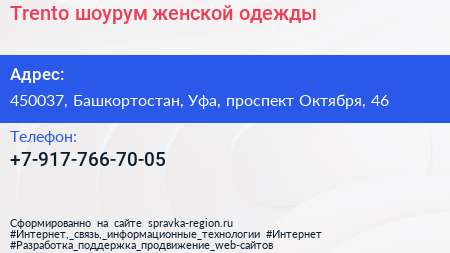 Trento, шоурум женской одежды по адресу 450037, Башкортостан, Уфа, проспект Октября, 46 в дальнейшем Организация, размещена в следующих категориях:
