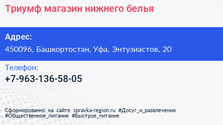 Триумф, магазин нижнего белья по адресу 450096, Башкортостан, Уфа, Энтузиастов, 20 в дальнейшем Организация, размещена в следующих категориях:
