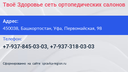 Твоё Здоровье, сеть ортопедических салонов по адресу 450038, Башкортостан, Уфа, Первомайская, 98 в дальнейшем Организация, размещена в следующих категориях: