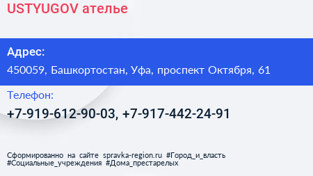 USTYUGOV, ателье по адресу 450059, Башкортостан, Уфа, проспект Октября, 61 в дальнейшем Организация, размещена в следующих категориях: