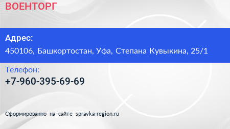ВОЕНТОРГ по адресу 450106, Башкортостан, Уфа, Степана Кувыкина, 25/1 в дальнейшем Организация, размещена в следующих категориях: