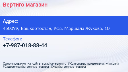 Вертиго, магазин по адресу 450099, Башкортостан, Уфа, Маршала Жукова, 10 в дальнейшем Организация, размещена в следующих категориях: