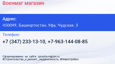 Военмаг, магазин по адресу 450049, Башкортостан, Уфа, Чудская, 3 в дальнейшем Организация, размещена в следующих категориях: