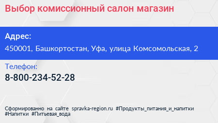 Выбор, комиссионный салон-магазин по адресу 450001, Башкортостан, Уфа, улица Комсомольская, 2 в дальнейшем Организация, размещена в следующих категориях: