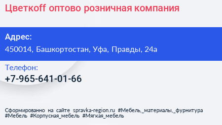 Цветкоff, оптово-розничная компания по адресу 450014, Башкортостан, Уфа, Правды, 24а в дальнейшем Организация, размещена в следующих категориях: