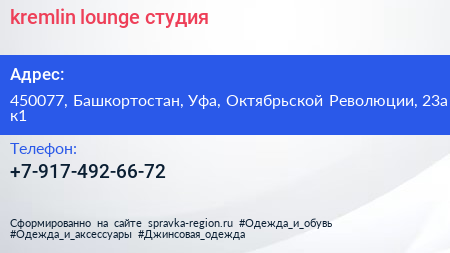 kremlin lounge, студия по адресу 450077, Башкортостан, Уфа, Октябрьской Революции, 23а к1 в дальнейшем Организация, размещена в следующих категориях: