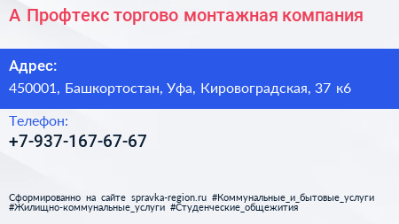 А-Профтекс, торгово-монтажная компания по адресу 450001, Башкортостан, Уфа, Кировоградская, 37 к6 в дальнейшем Организация, размещена в следующих категориях: