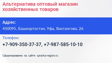 Альтернатива, оптовый магазин хозяйственных товаров по адресу 450095, Башкортостан, Уфа, Вахтангова, 26 в дальнейшем Организация, размещена в следующих категориях: