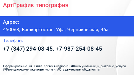 АртГрафик, типография по адресу 450068, Башкортостан, Уфа, Черниковская, 46а в дальнейшем Организация, размещена в следующих категориях: