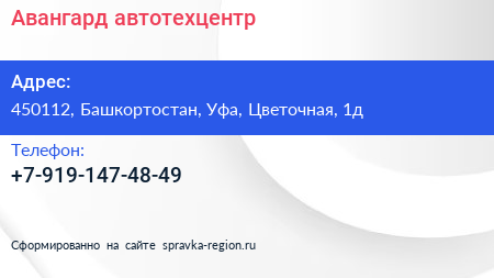 Авангард, автотехцентр по адресу 450112, Башкортостан, Уфа, Цветочная, 1д в дальнейшем Организация, размещена в следующих категориях: