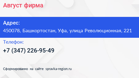 Август, фирма по адресу 450078, Башкортостан, Уфа, улица Революционная, 221 в дальнейшем Организация, размещена в следующих категориях: