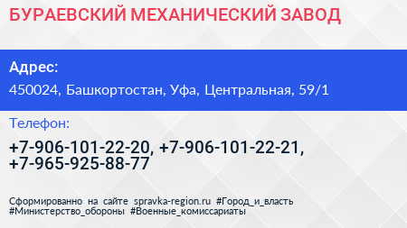 БУРАЕВСКИЙ МЕХАНИЧЕСКИЙ ЗАВОД по адресу 450024, Башкортостан, Уфа, Центральная, 59/1 в дальнейшем Организация, размещена в следующих категориях: