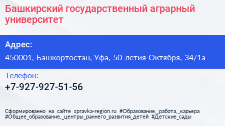 Башкирский государственный аграрный университет по адресу 450001, Башкортостан, Уфа, 50-летия Октября, 34/1а в дальнейшем Организация, размещена в следующих категориях:
