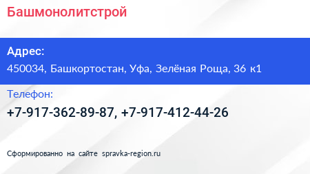 Башмонолитстрой по адресу 450034, Башкортостан, Уфа, Зелёная Роща, 36 к1 в дальнейшем Организация, размещена в следующих категориях: