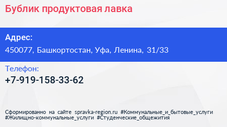 Бублик, продуктовая лавка по адресу 450077, Башкортостан, Уфа, Ленина, 31/33 в дальнейшем Организация, размещена в следующих категориях: