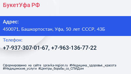 БукетУфа.РФ по адресу 450071, Башкортостан, Уфа, 50 лет СССР, 43Б в дальнейшем Организация, размещена в следующих категориях:
