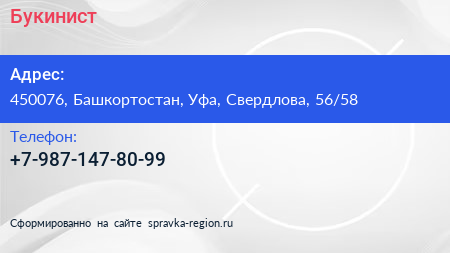 Букинист по адресу 450076, Башкортостан, Уфа, Свердлова, 56/58 в дальнейшем Организация, размещена в следующих категориях: