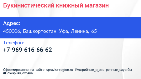 Букинистический, книжный магазин по адресу 450006, Башкортостан, Уфа, Ленина, 65 в дальнейшем Организация, размещена в следующих категориях: