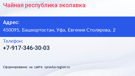 Чайная республика, эколавка по адресу 450095, Башкортостан, Уфа, Евгения Столярова, 2 в дальнейшем Организация, размещена в следующих категориях: