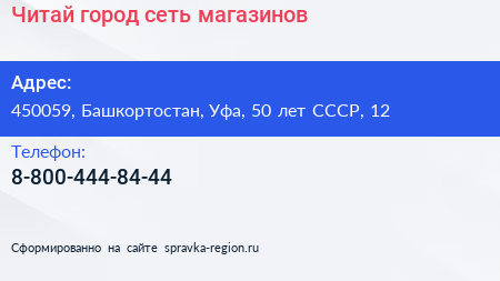Читай-город, сеть магазинов по адресу 450059, Башкортостан, Уфа, 50 лет СССР, 12 в дальнейшем Организация, размещена в следующих категориях: