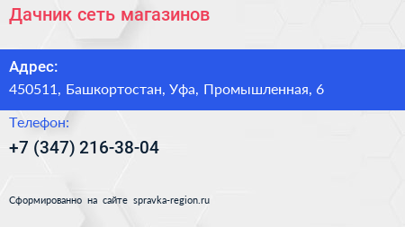 Дачник, сеть магазинов по адресу 450511, Башкортостан, Уфа, Промышленная, 6 в дальнейшем Организация, размещена в следующих категориях: