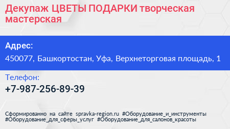 Декупаж ЦВЕТЫ & ПОДАРКИ, творческая мастерская по адресу 450077, Башкортостан, Уфа, Верхнеторговая площадь, 1 в дальнейшем Организация, размещена в следующих категориях: