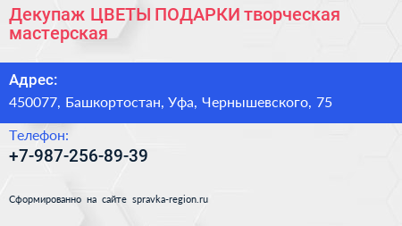 Декупаж ЦВЕТЫ & ПОДАРКИ, творческая мастерская по адресу 450077, Башкортостан, Уфа, Чернышевского, 75 в дальнейшем Организация, размещена в следующих категориях: