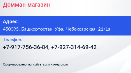 Домман, магазин по адресу 450095, Башкортостан, Уфа, Чебоксарская, 21/1а в дальнейшем Организация, размещена в следующих категориях: