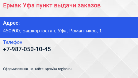 Ермак-Уфа, пункт выдачи заказов по адресу 450900, Башкортостан, Уфа, Романтиков, 1 в дальнейшем Организация, размещена в следующих категориях: