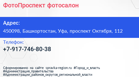 ФотоПроспект, фотосалон по адресу 450098, Башкортостан, Уфа, проспект Октября, 112 в дальнейшем Организация, размещена в следующих категориях: