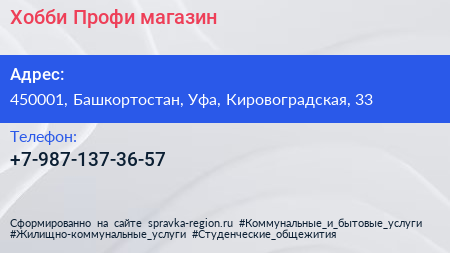 Хобби-Профи, магазин по адресу 450001, Башкортостан, Уфа, Кировоградская, 33 в дальнейшем Организация, размещена в следующих категориях: