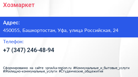 Хозмаркет по адресу 450055, Башкортостан, Уфа, улица Российская, 24 в дальнейшем Организация, размещена в следующих категориях: