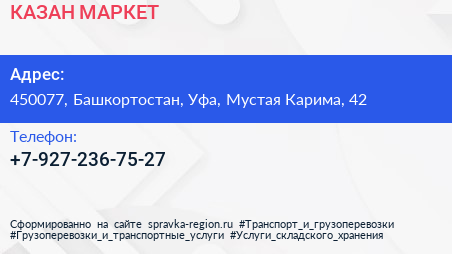 КАЗАН МАРКЕТ по адресу 450077, Башкортостан, Уфа, Мустая Карима, 42 в дальнейшем Организация, размещена в следующих категориях: