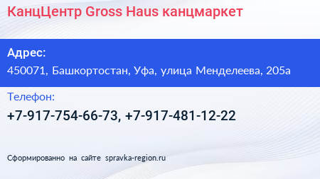 КанцЦентр & Gross Haus, канцмаркет по адресу 450071, Башкортостан, Уфа, улица Менделеева, 205а в дальнейшем Организация, размещена в следующих категориях: