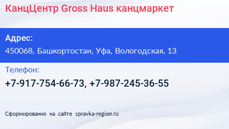 КанцЦентр & Gross Haus, канцмаркет по адресу 450068, Башкортостан, Уфа, Вологодская, 13 в дальнейшем Организация, размещена в следующих категориях: