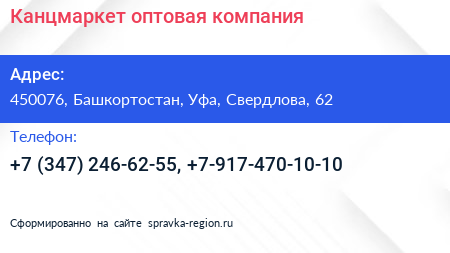 Канцмаркет, оптовая компания по адресу 450076, Башкортостан, Уфа, Свердлова, 62 в дальнейшем Организация, размещена в следующих категориях: