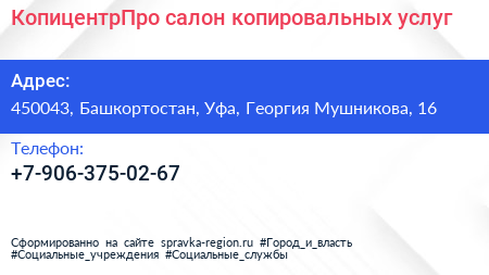 КопицентрПро, салон копировальных услуг по адресу 450043, Башкортостан, Уфа, Георгия Мушникова, 16 в дальнейшем Организация, размещена в следующих категориях: