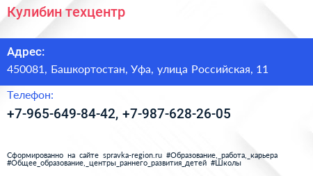 Кулибин, техцентр по адресу 450081, Башкортостан, Уфа, улица Российская, 11 в дальнейшем Организация, размещена в следующих категориях:
