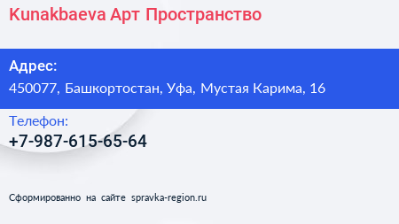 Kunakbaeva Арт-Пространство по адресу 450077, Башкортостан, Уфа, Мустая Карима, 16 в дальнейшем Организация, размещена в следующих категориях: