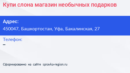 Купи слона, магазин необычных подарков по адресу 450047, Башкортостан, Уфа, Бакалинская, 27 в дальнейшем Организация, размещена в следующих категориях: