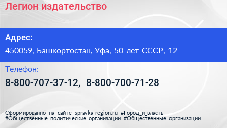 Легион, издательство по адресу 450059, Башкортостан, Уфа, 50 лет СССР, 12 в дальнейшем Организация, размещена в следующих категориях: